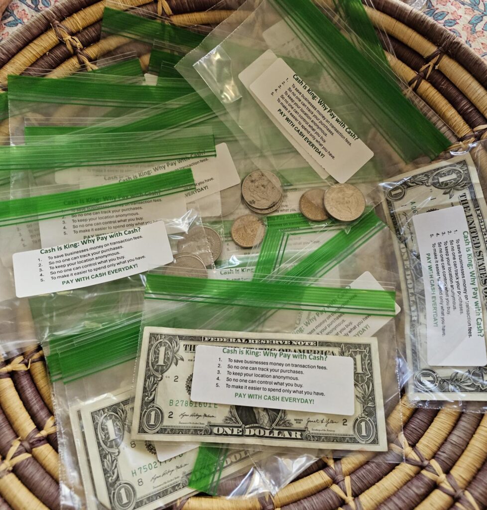 “I subscribe to Solari and heard about cash for Halloween at the Rogue Food Conference from Catherine Austin Fitts. We decided to go for it at Halloween, we got silver dollars, dollar bills and half dollars and put them in baggies with the “Cash is King” stickers and handed them out instead of candy.