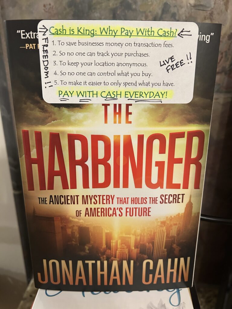 “I am attaching the “Cash is King” labels to “Little Free Library Books!” I like the sticker visible, hopefully on the outside cover. It’s less about the book, and more about keeping the cash message visible to the reader, or anyone picking up the book or looking at it on a table. I also love using a book that might make the reader think about a certain topic deeper, a wake up call if you will. EMFs, mind control, and because I’m a Christian, spreading the Word of God. Christianity, etc.”